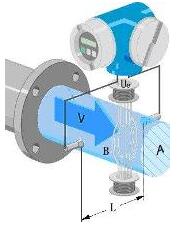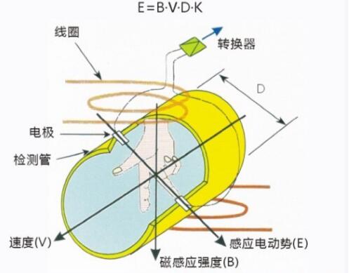 电磁流量计的基本原理是法拉第电磁感应定律,即测量管内的导电介质相当于法拉第试验中的导电金属杆,上下两端的两个电磁线圈产生恒定磁场。当有导电介质流过时,则会产生感应电动势,电动势的方向按“弗来明右手规则”,感应电势的大小由下式确定: