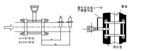 如果被测量介质需要进行温度压力补偿时(如蒸汽、压缩空气),则测压点应在流量计下游约束~5D处,测温点应在流量计流量下游4~8D处(如下图所示)